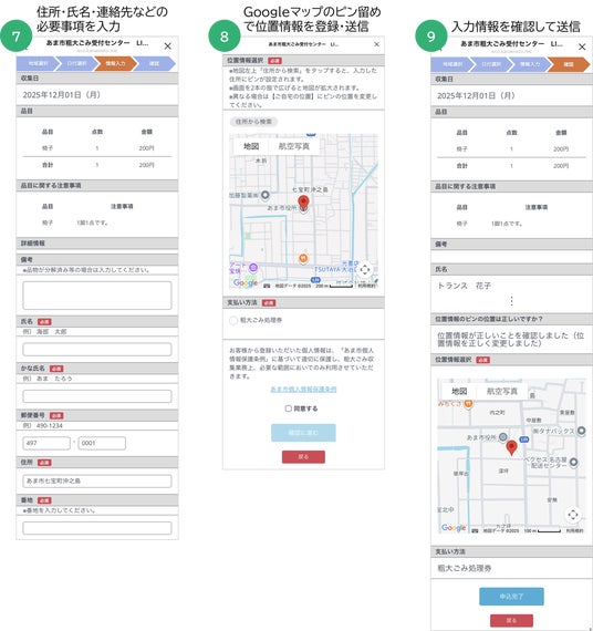 続いて、収集希望者の住所・氏名・連絡先・排出場所などの情報を入力します。粗大ごみの排出場所については、Googleマップにピン留めする形で位置情報を登録できます。同一の住所に複数の家屋が存在する場合があるため、収集先に関してより精度が高い情報を取得することができます。最後に、入力情報を確認、送信することで収集申込みが完了します。