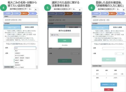 粗大ごみの分類や名称から捨てたい品目を検索し、数量を指定します。排出品目を登録する際、ポップアップで注意事項が表示されます。