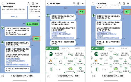 「KANAMETO」のキーワード応答機能を活用して、ごみ分別の案内サービスを提供しています。あま市LINE公式アカウントのトークルームにてごみの名称を入力すると、分別方法や出し方について自動応答します。