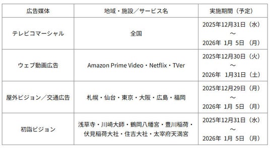 本動画は、年末年始を中心に、テレビコマーシャルやウェブ動画広告に加え、主要都市の屋外ビジョン(※1)や交通広告、さらには数多くの参拝客が訪れる寺社の初詣ビジョン(※2)でも展開します。テレビコマーシャルにおいては、アクセシビリティの観点から、字幕表示に対応しました(※3)。また、本日12月19日より、当社ウェブサイトの広告ライブラリー(https://jp.sharp/cm/)でもご覧いただけます。