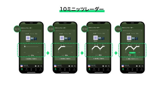 今回LINE MUSICアプリ内の「My推し」スペースに追加された新機能「10ミニッツレーダー」は、「My推し」に登録した推しアーティストの楽曲がランキングに入っている場合※に、順位の変化を10分ごとにチェックできる機能です。これまで1時間単位で把握していたランキングの動きを、より詳細に可視化することで、楽曲のリリース直後や、ランキングが動きやすい時間帯における「順位が上昇している」「もう一押しが必要」といった状況を素早く把握できる新体験が可能となります。推しの“いま”の動きをリアルタイムで感じながら、再生やシェアといった応援行動につなげられる点が特長で、ファンにとって、これまで以上に能動的で参加感のある推し活(再生)体験を提供します。