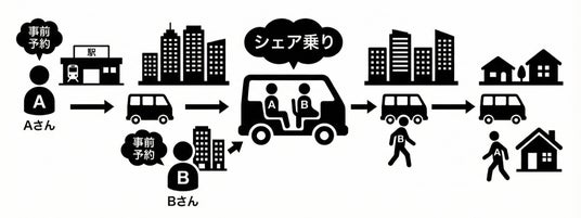 駅から自宅方面へ向かうAさんは、予約した時間に近くの乗車ポイントへ。一方でBさんも同じエリア方面に向かう利用者として、駅周辺から同じ車両に相乗りします。相乗りだからと言って料金は半々となるのではなく、料金は乗車距離に応じて按分されます。
