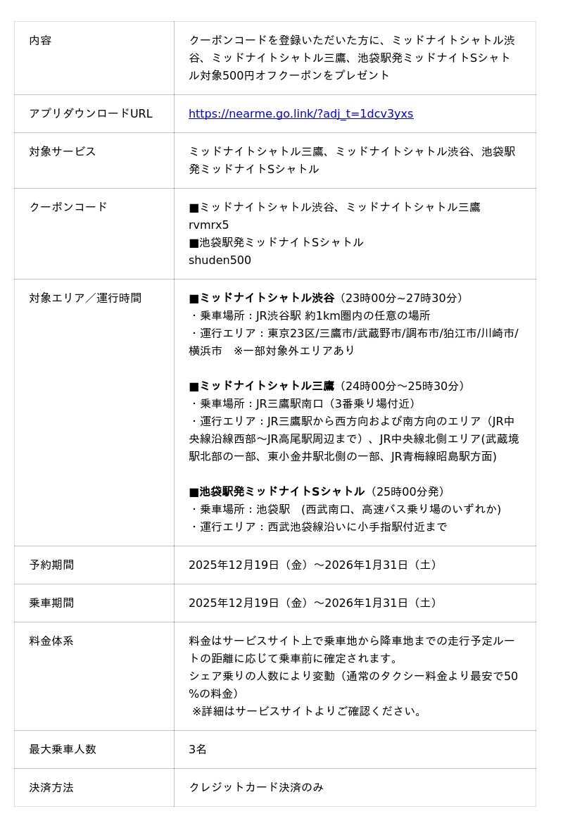 移動の課題に取り組むソーシャルデザインカンパニーの株式会社NearMe(本社:東京都中央区、代表取締役社長:高原幸一郎、以下:ニアミー)は、忘年会・新年会シーズンの深夜移動における課題解決を目的として、『ミッドナイトシャトル』(ミッドナイトシャトル渋谷、ミッドナイトシャトル三鷹、池袋駅発ミッドナイトSシャトル)を対象とした『ミッドナイトシャトル』忘新年会帰宅キャンペーン開始を本日から開始いたします。