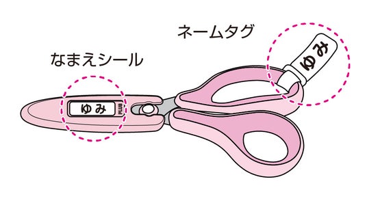 キャップ・ハンドルに貼る「なまえシール」と、ハンドルに留める「ネームタグ」を付属。「なまえシール」は2枚あるので、貼り直しや書き直しができ、自分のはさみがすぐに分かります。