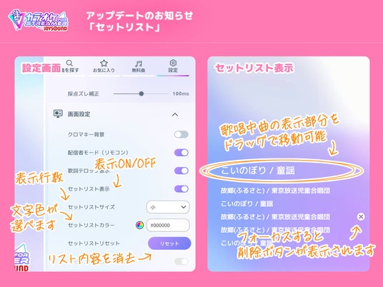 【新機能】12月のアップデートで、配信中に歌唱した楽曲を画面上に表示できる機能「セットリスト」を実装しました。