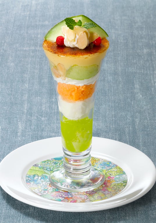 アーティスト独自の感性が光るデザイン『あじさい』は、夏の訪れを感じさせる作品です。色鮮やかな大輪の花や小さな蕾、ダイナミックな葉が繊細に描かれ、初夏にふさわしい緑のメロンデザートと見事に調和し、さわやかな夏の彩りを演出しました。