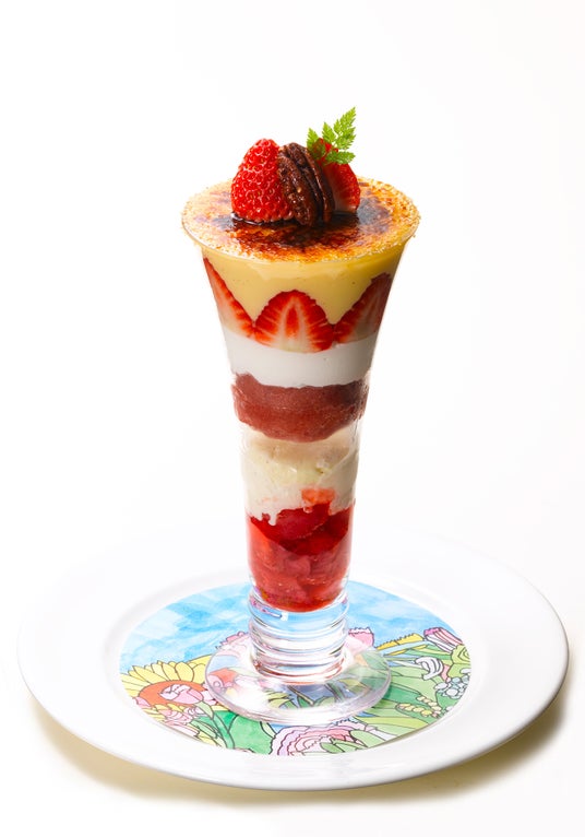 アーティスト独自の感性で創作された、鮮やかな色使いが、赤と緑の可愛らしい色合いの苺のデザートを彩り、春の訪れを感じさせるデザートの魅力をさらに引き立てました。