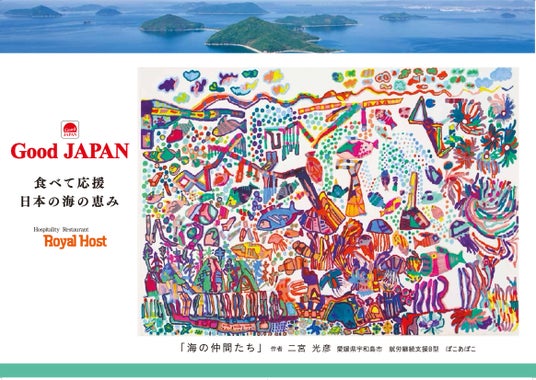 ロイヤルホストでは「召し上がれ日本の恵み 国産素材」をテーマに、国産食材の生産者様とその消費を応援しながら、それぞれの素材の旨みを活かしたメニューをお届けする「Good JAPAN」企画を展開しています。その中で提供する御膳の敷紙やドリンクのコースターには、「シブヤフォント」および「就労継続支援B型 ぽこあぽこ」のアーティストの作品を起用いたしました。季節デザートとあわせ、フェアメニューにおいても、個性豊かなアート作品とともに豊かな食体験をお届けしてまいります。※画像はすべてイメージです。