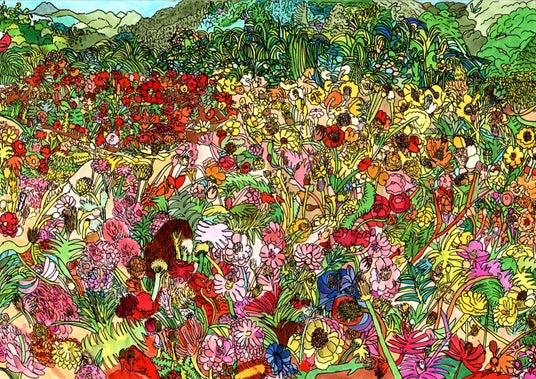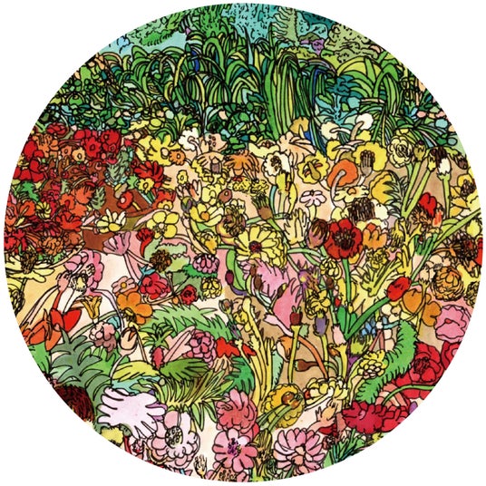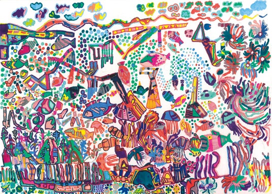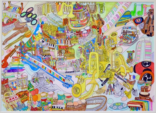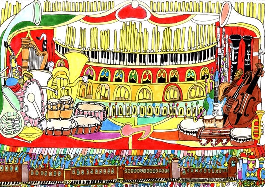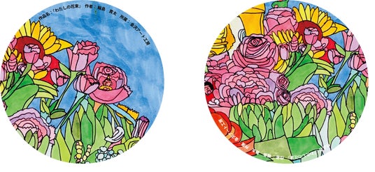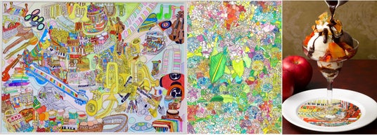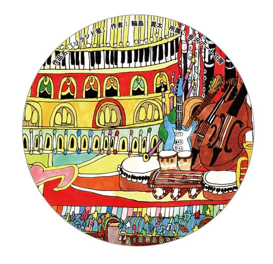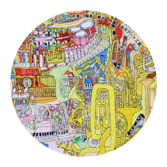 『Philhar World』は、元気になる黄色をメインとしたポップな色使いと楽しさを感じる作品です。作家の「音楽を聴いたり、リズムに乗って踊ることが大好き!」という思いが多種多彩な楽器とともに描写され、ロイヤルホストの夏のマンゴーデザートの彩りとの相性が良く、楽しさと活気を加えました。