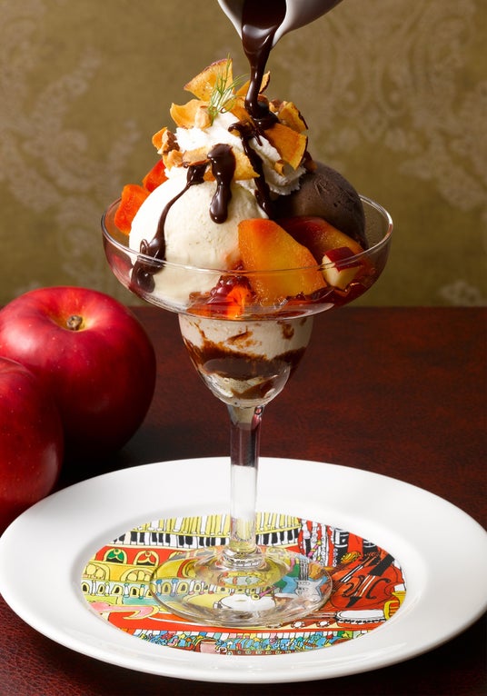 音楽の惑星を舞台としたデザインです。壮大な宇宙のコンサート舞台、楽器の数々、そして弦楽器の彩りを描いたデザインが、りんごデザートの色合いと融合し、「お⽫の上のちいさな美術館」としてお楽しみいただけるようにいたしました。