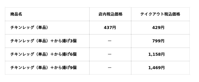 ※チキンレッグ(単品)+から揚げ商品のテイクアウト価格については、10%オフした金額となります。