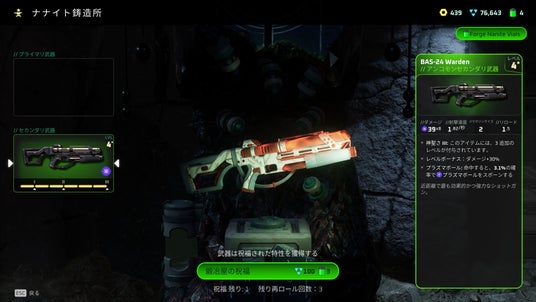 フォージ(鍛造)システムの追加セーフルームの「ナノマイト・フォージ」では、敵の撃破やテック使用で獲得できるレア通貨「テック + ナノマイトバイアル」を消費することで、手持ちの武器を鍛造し「祝福特性」を付与できます。