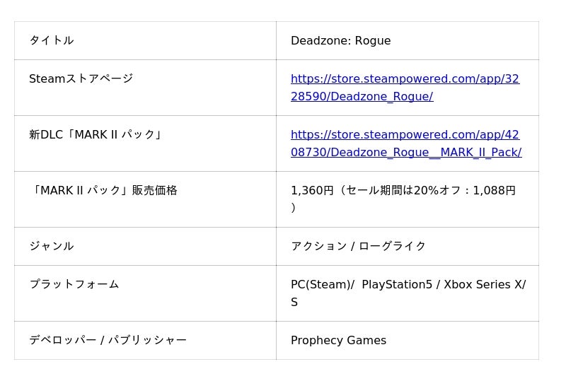 あわせて、2025年12月19日から開催されるSteamウィンターセールでは、『Deadzone: Rogue』本編が30%となるほか、有料DLC「Operative Pack」、オリジナルサウンドトラックもお得に購入できます。