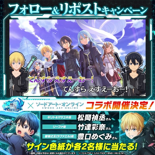 株式会社バンダイナムコエンターテインメントより配信しているApp Store/Google Play向けスマートフォンアプリ『転生したらスライムだった件 魔王と竜の建国譚』(以下まおりゅう)は、「ソードアート・オンライン」とのコラボを開始したことをお知らせします。Part.1 スカウトにはキリト、ALOアスナ衣装のリムルが登場!また、リーファ、キリト衣装のマサユキがもらえるログインボーナスも開催!新イベント「リローデッド・ワールド」も開催中!限定のコラボストーリーは、フルボイスでお楽しみいただけます!さらに魔晶石が最大300個GETできるキャンペーンも開催!