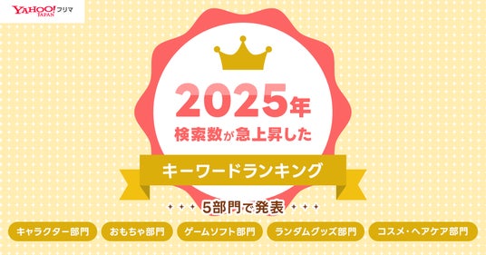 LINEヤフー株式会社(以下、LINEヤフー)が提供するフリマアプリ・サービス「Yahoo!フリマ」は、キャラクターやおもちゃ、ゲームソフト、ランダムグッズ、コスメ・ヘアケアの5部門において、前年と比べ検索数が急上昇したキーワードを集計(※1)し、「検索急上昇ランキング 2025」として公開します。