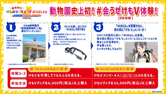 本コラボでは、株式会社NTTコノキューデバイスが開発しコノキューが販売するXRグラス「MiRZA(R)(ミルザ)」を装着すると、「けもV」メンバーとコミュニケーションが取れる、「XR体験」を行うことができる。XR体験に来園するメンバーはフンボルトペンギン、シマハイイロギツネ、カラカル、ウサギコウモリの4名を予定。
