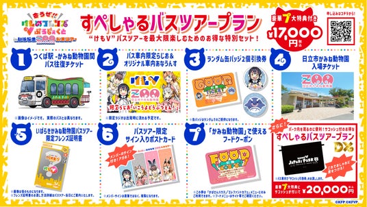 1.つくば駅-日立市かみね動物園間バス往復チケット / 2.バス車内限定らじお & オリジナル車内あなうんす / 3.ランダム缶バッジ2個引換券 / 4.日立市かみね動物園入場チケット / 5.バスツアー限定フレンズ証明書 / 6.バスツアー限定サイン入りポストカード / 7.かみね動物園で使えるフードクーポン
