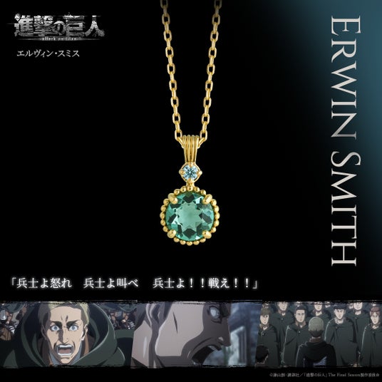 身に纏うグリーンのマントをイメージしたマラカイト(12月誕生石)にジュビリーカットのホワイトクォーツを重ねたオリジナルストーンを使用。仲間や部下を先導するリヴァイ兵士長の姿を重ねました。