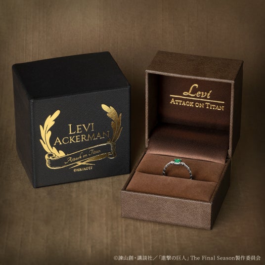 12月25日のリヴァイ兵士長の誕生日を記念してデザインしたコラボレージョンリングには、グリーンの天然石を基調につやめくプラチナときらめくダイヤモンドを使用。素材や細部のデザインまでこだわり、誕生日に相応しい高級感溢れる特別なジュエリーに仕上げました。商品は豪華BOXに包み、コラボレーションの為に特別に描き下ろしたアートを使用したアクリルリングスタンドとご一緒にお届けいたします。