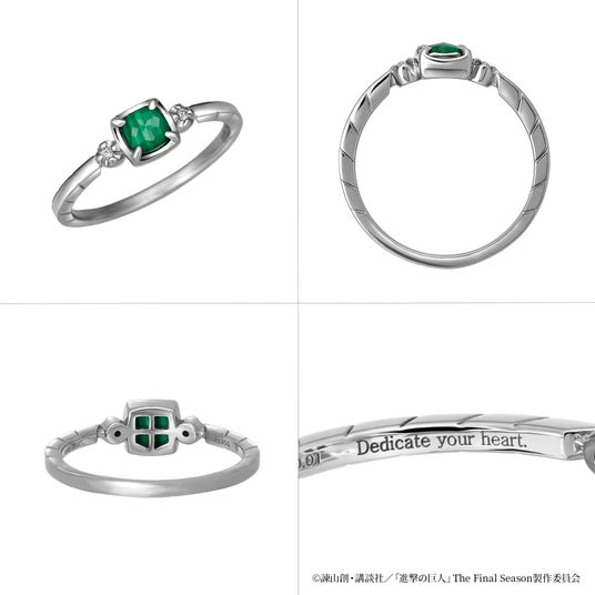 <刻印>リングの内側には“Dedicate your heart.(心臓を捧げよ)”のメッセージがさりげなく刻印されており、リヴァイ兵士長や物語の世界観をいつも近くに感じて頂けます。高品位なプラチナ950を使用し、末長くご愛用していただけるジュエリーに仕上げました。