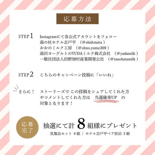 Instagramにて、プレゼントキャンペーンを実施中!各社公式アカウントフォロー&対象の投稿に「いいね」すると、抽選で、岩手県産乳製品詰め合わせセット(おおのミルク工房:2組・YUDAミルク:2組・(一社)田野畑村産業開発公社:2組)、湯の杜ホテル志戸平ペア宿泊ご招待(2組)が当たります!*応募期間:2025年12月10日(水)~12月25日(木)