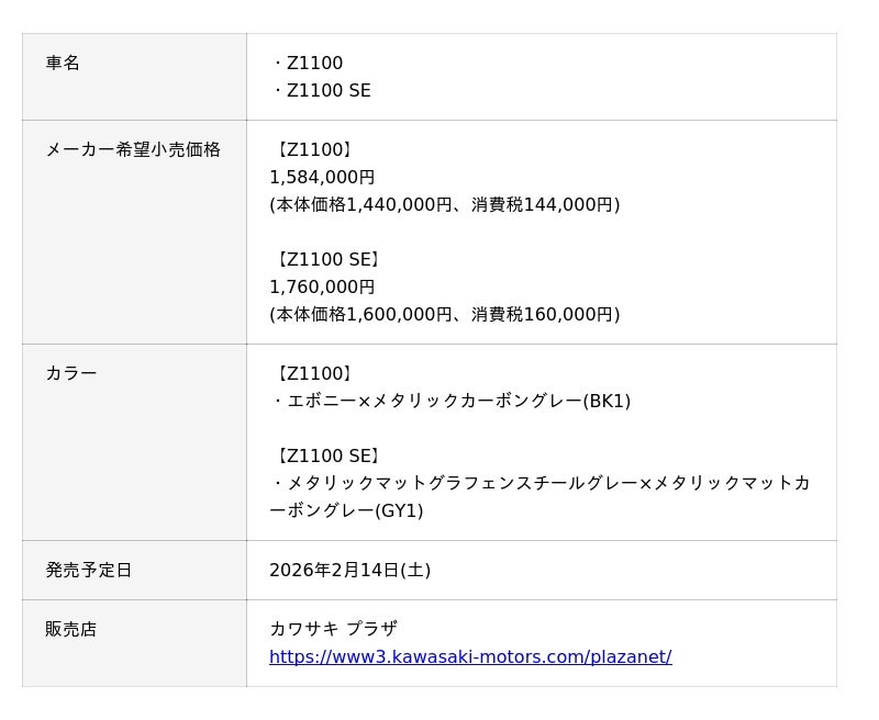 株式会社カワサキモータースジャパン(本社:兵庫県明石市、代表取締役社長:佐伯 健児)は、「Z1100」、「Z1100 SE」を、2026年2月14日(土)に新発売いたします。