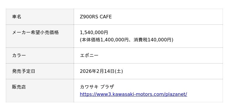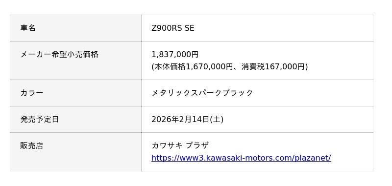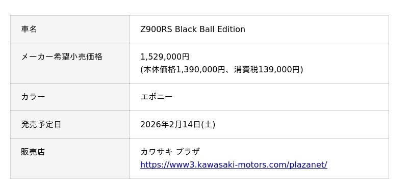 株式会社カワサキモータースジャパン(本社:兵庫県明石市、代表取締役社長:佐伯 健児)は、レトロスポーツモデル「Z900RS Black Ball Edition」「Z900RS SE」「Z900RS CAFE」を、2026年2月14日(土)に新発売いたします。