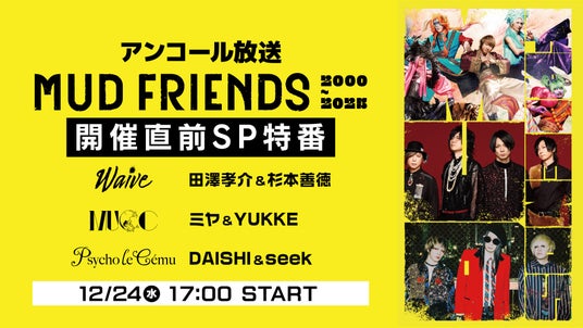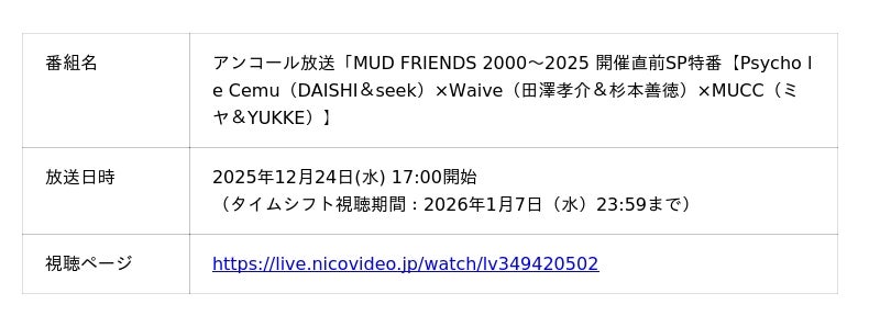 アンコール放送「MUD FRIENDS 2000~2025 開催直前SP特番【Psycho le Cemu(DAISHI&seek)×Waive(田澤孝介&杉本善徳)×MUCC(ミヤ&YUKKE)】