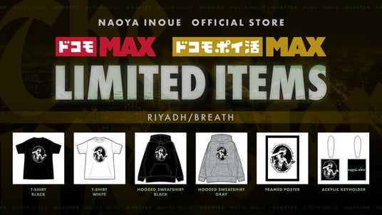 「ドコモ MAX」「ドコモ ポイ活MAX」ご利用のお客さま限定で購入できる井上尚弥選手公式限定アイテム「RIYADH/BREATH」シリーズが好評販売中です。「ドコモ MAX」「ドコモ ポイ活MAX」ご利用のお客さまは、井上尚弥選手公式ストア「MONSTER」からご購入いただけます。