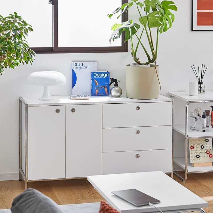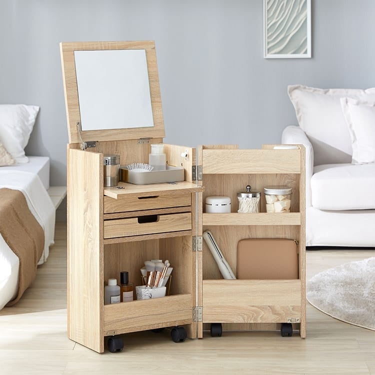 シンプルでスマートな印象のお部屋を叶えてくれる多機能一体型の商品です。天板の内側にミラーがついているため、天板を開くだけでドレッサーに早変わり!手前の板を倒すと、物が取り出しやすくなるため、メイクなどの作業も快適に行えます。
