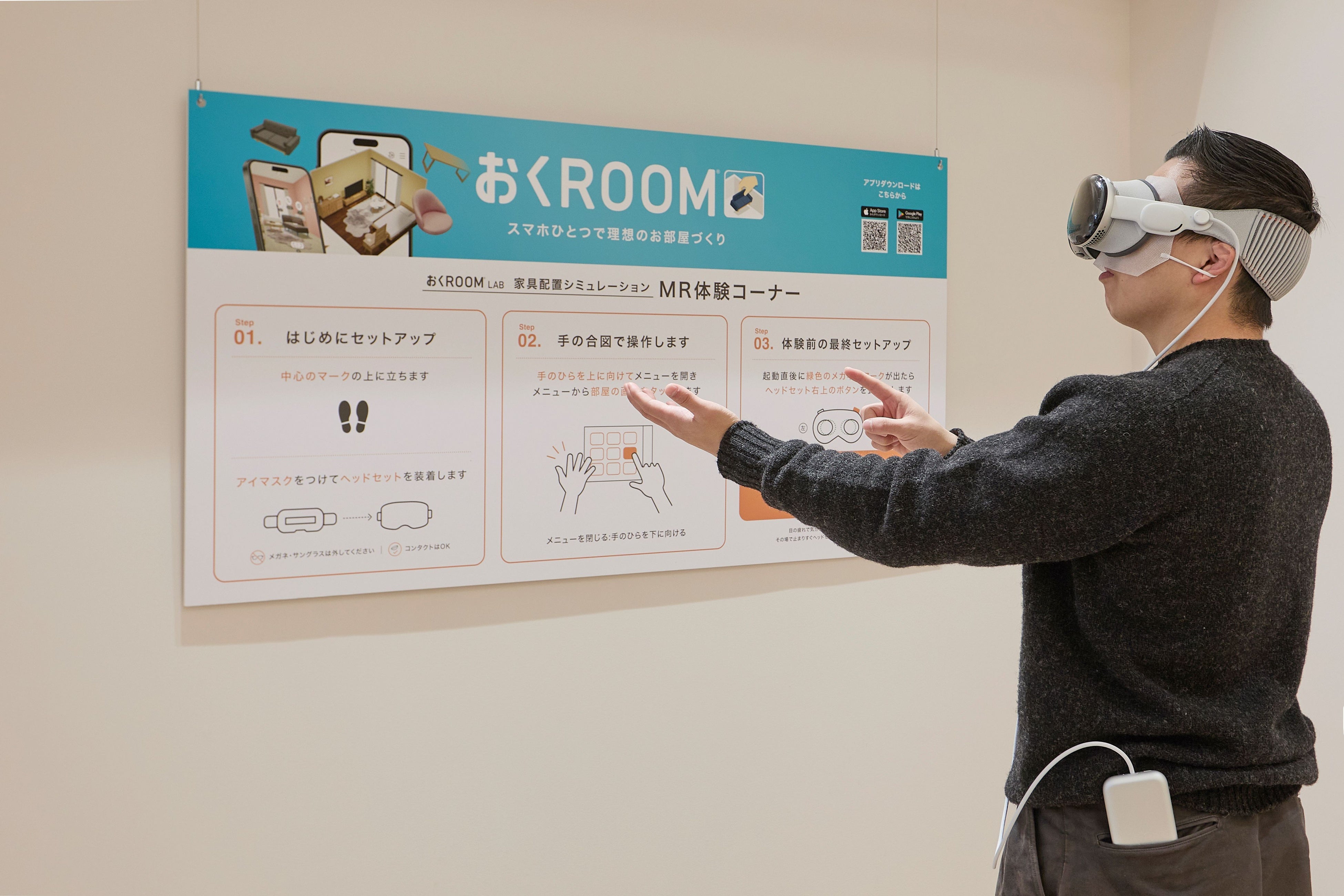 国内家具・インテリア業界で、初の試み(※)!独自開発したアプリ× 「Vision Pro」を用い、MR技術による最先端の没入型3D家具配置シミュレーションコーナー「おくROOM(R) LAB」を設置。