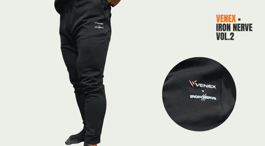 左太腿あたりに「IRON NERVE×VENEX」コラボロゴをプリント。