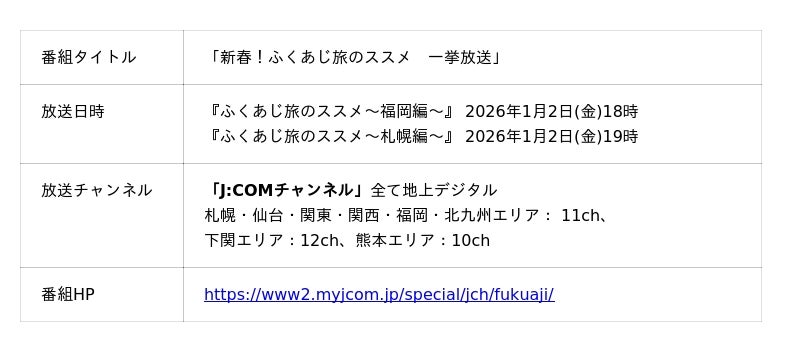 また、1月2日(金)の放送では「新春!ふくあじ旅のススメ 一挙放送」と題し、新作の大阪編と併せて「福岡編」と「札幌編」もお届けいたします。「福岡編」では、俳優の山口智子さん、「札幌編」では北海道発演劇ユニット「TEAM NACS」のリーダー森崎博之さんが小山さんとともに各地域の「ふくあじ」に触れる旅の模様をお届けします。
