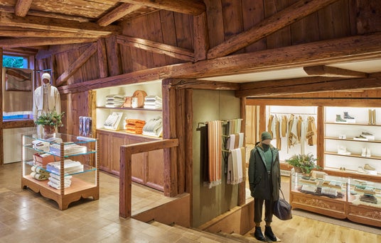 店舗のインテリアコンセプトは、伝統的なシャレースタイルの空間に残る木造建築を軸に展開しています。1950年代に建てられたこの歴史的建築は、オリジナルの骨組みをそのままに、丁寧に保存・改修されています。ファサードはメゾンの伝統とルーツへのオマージュであり、ヴァルセージア地方特有の片麻岩の上に築かれ、ロロ・ピアーナのシグネチャーカラーであるクンメル色のラッカーで仕上られた金属のディテールと地元産の無垢材が調和しています。