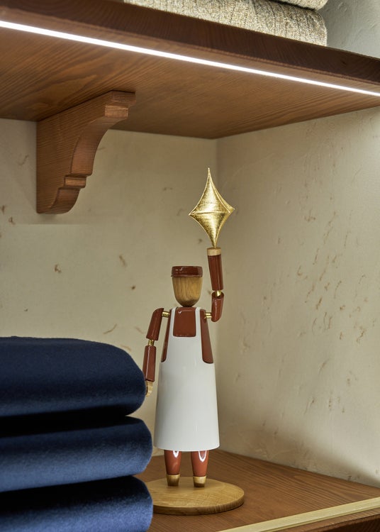 ホリデーシーズンを祝した店舗のウィンドウには、祝祭の雰囲気が溢れています。ロロ・ピアーナのシグネチャーであるクンメルのボックスが整然と積み重ねられ、その周りで金色の星が輝きを放ちます。あちこちに散りばめられた小さなクンメルとグリーンの木製ミニチュア職人たちが、メゾンの製品を喜びに満ちた思い出に残るギフトへと昇華させています。