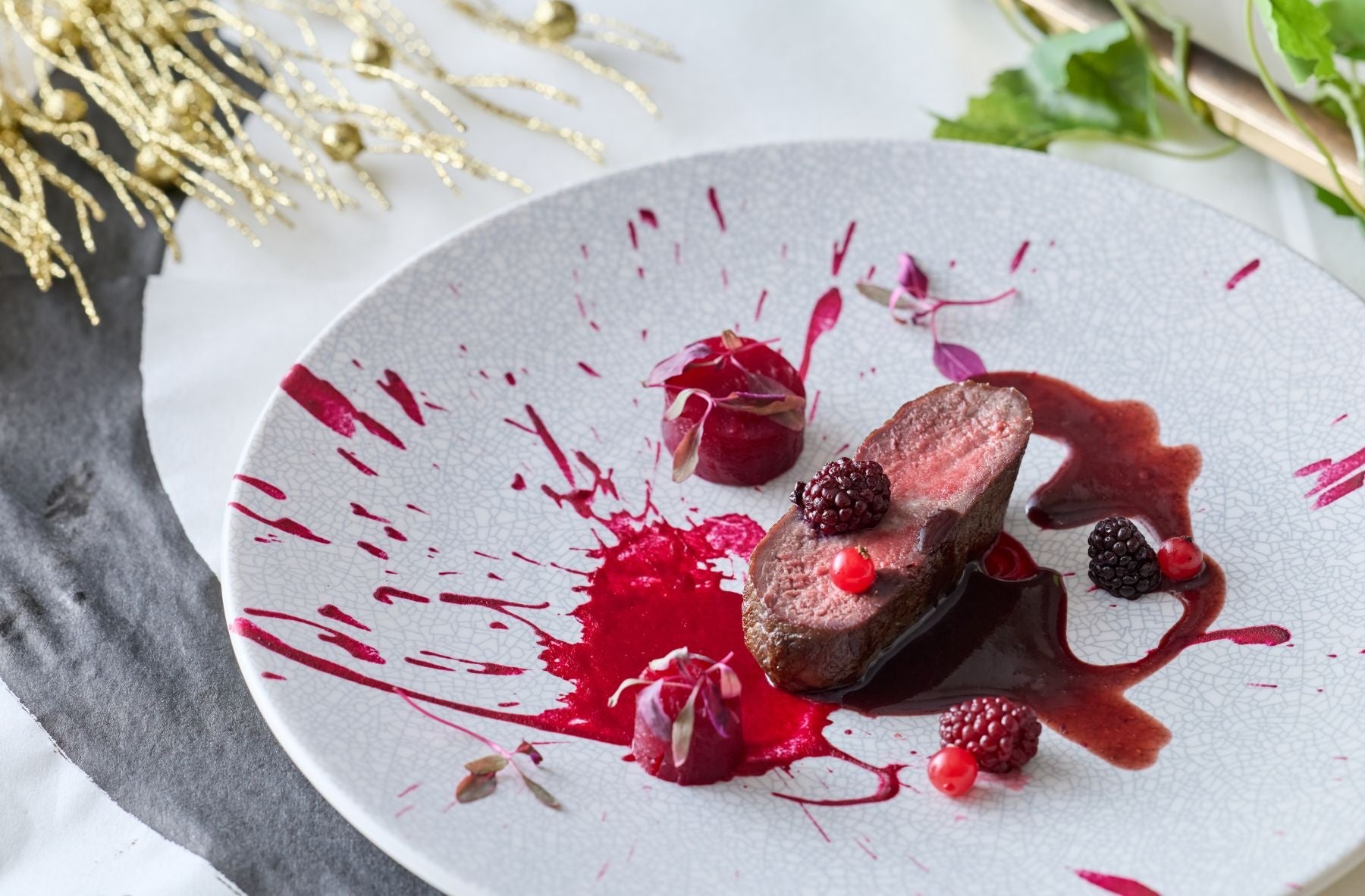 【肉料理】北海道蝦夷鹿ロースのロティとビーツ 黒果実のソース