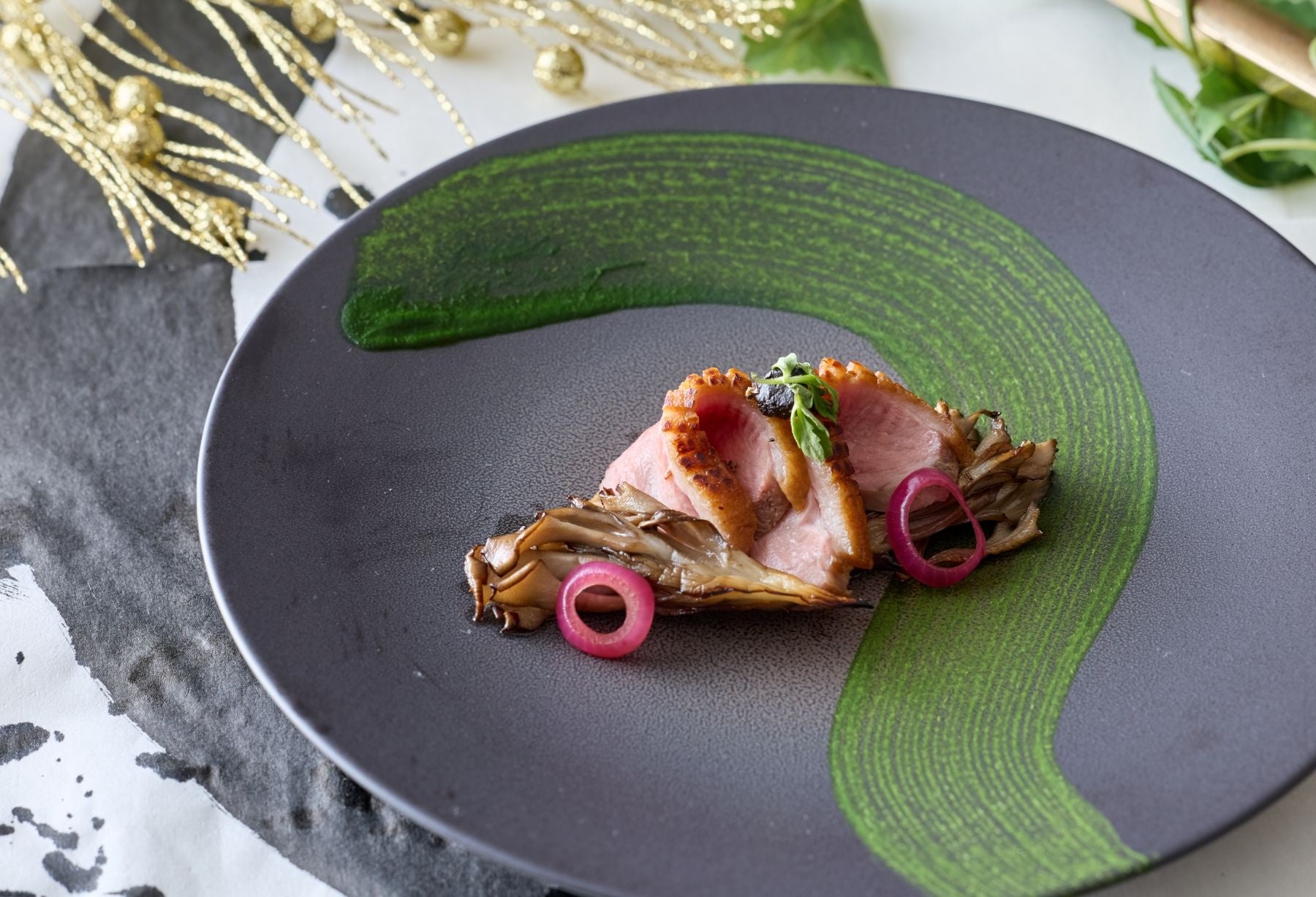 【前菜2.】合鴨胸肉のコンフィと九頭竜舞茸 黒胡椒ソース 春菊と黒にんにく