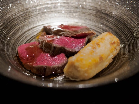 (国産牛ランプステーキ 海老芋唐揚げ)