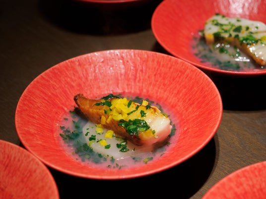(本日の鮮魚 蕪 浅利スープ 春菊 柚子)