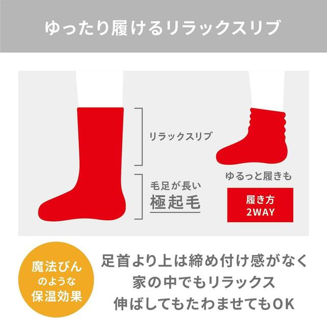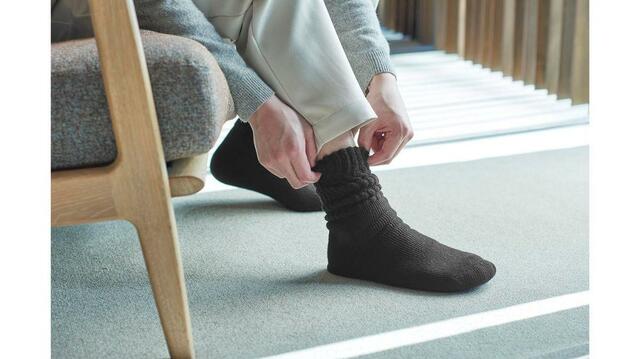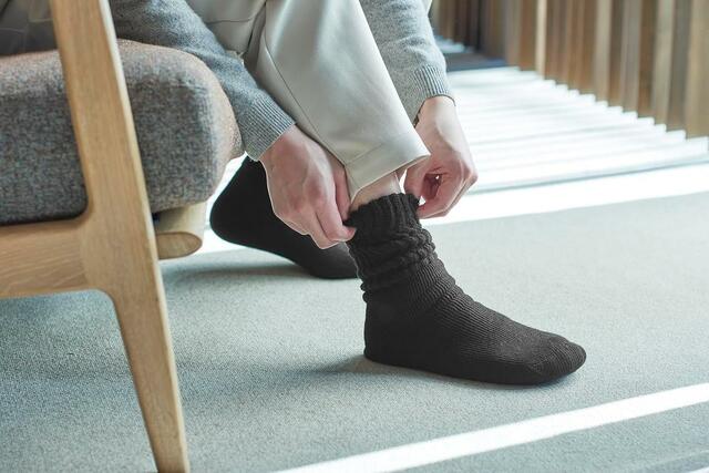 お部屋でのリラックスタイムや寒い日の足元対策として、日常使いしやすいミドル丈。定番カラーのブラックは、家の中でも見た目を選ばず使えるのも魅力です。
