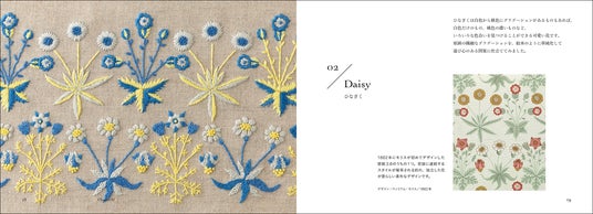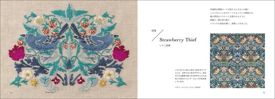 アーツ・アンド・クラフツ運動の精神を象徴する「いちご泥棒」や、愛らしい「兄弟うさぎ」など、人気の高い図案を20種類掲載。繊細な植物や動物たちの生き生きとした美しさを、再現することができます。
