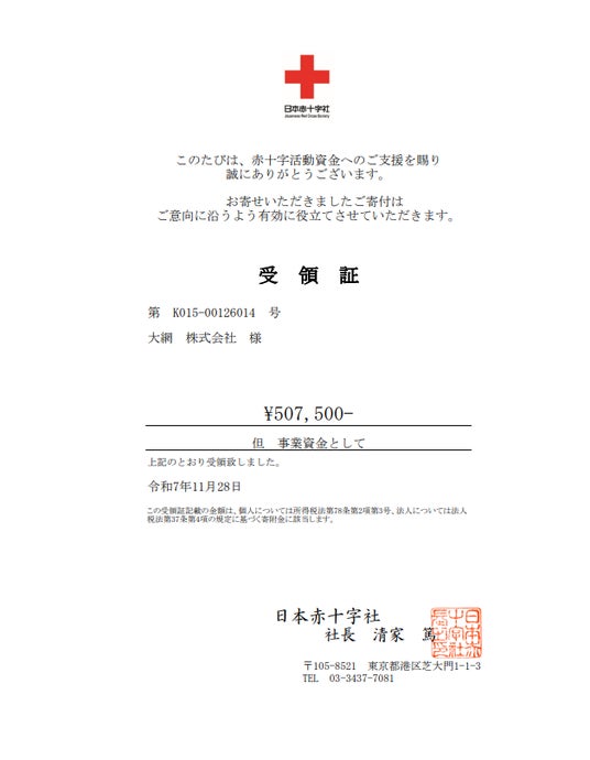 2.大網株式会社から、日本赤十字社への寄付を行いました。