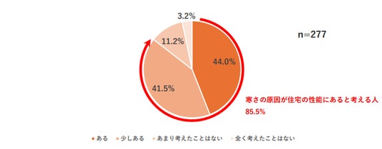 住宅が寒いと感じる要因はいくつかありますが、ご実家の寒さの理由として「断熱性能や気密性能の低さが原因かもしれない」と考えた人は合計で85%以上に達しました。 建物の性能そのものが原因と捉えている人が多いことがうかがえます。