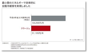 また、アエラホームの商品で特に「クラージュ」は、住宅内外部間の熱の流出量を極限まで抑えることで、平成4年省エネ基準住宅と比べて冷暖房費を約46%削減。しかも、CO2の排出量も約60%の削減を実現できるまさにエコノミー&エコロジーな住まいです。