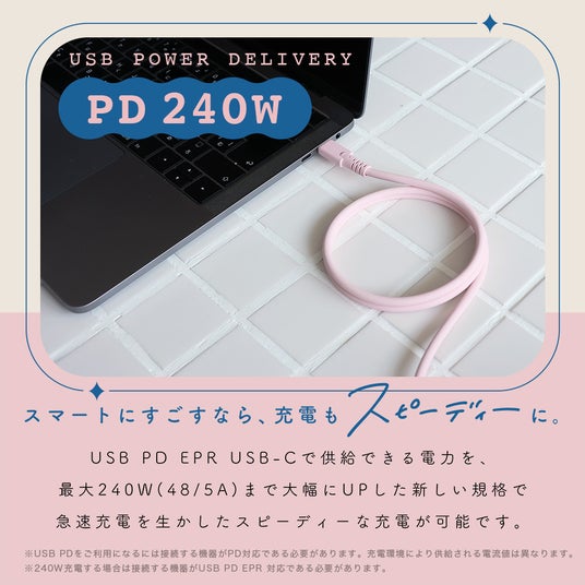 USB PD EPR。USB-Cで供給できる電力を、最大240W(48V/5A)まで対応。大きな電流を必要とするノートパソコンの充電やスマートフォン、タブレットまでこの1本でスピーディーな充電ができます。