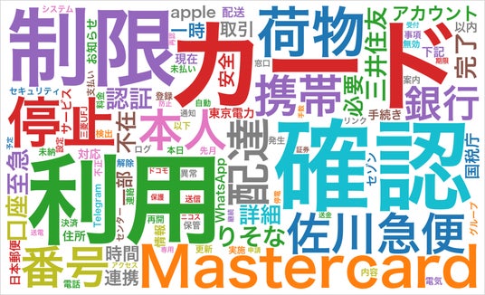 2025年は、金融機関をかたるSMSに関する「カード」や「銀行」、金融機関名などが頻出しました。また、宅配便の不在通知を装うSMSに関連して「荷物」や「配達」、宅配事業者名などが目立ちました。スミッシングの文面でよく使われる単語として、「制限」「確認」「利用」「停止」など、緊急性を連想させるワードも多く出現しました。ワードマップを参考に、スミッシング対策にお役立てください。