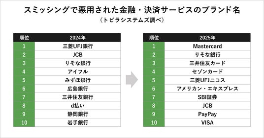 2025年にスミッシングで悪用されたブランド名のトップ3は、1位「Mastercard」、2位「佐川急便」、3位「りそな銀行」でした。