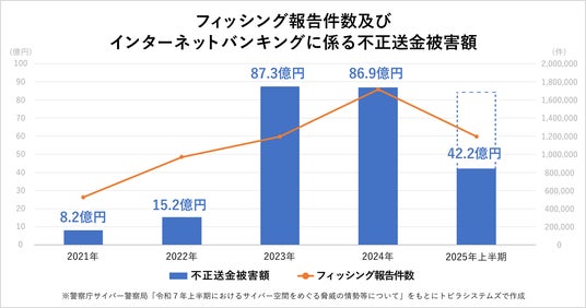 フィッシング報告件数およびインターネットバンキング不正送金被害額は年々増加しており、深刻な社会問題となっています。警察庁の発表では、2024年のインターネットバンキング不正送金被害額は86.9億円で、高水準で推移が続いています。2025年上半期は既に42.2億円に達し、前年同期比で1.7倍に上っています。