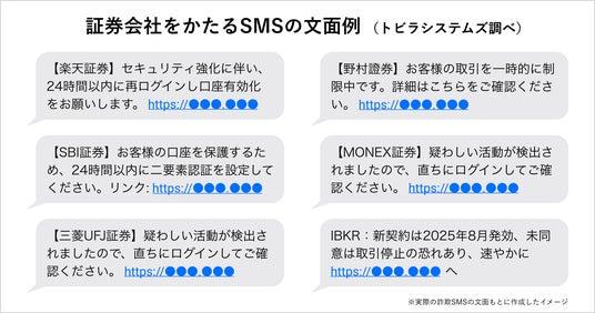 2025年上半期には、インターネット証券口座のアカウントが不正に乗っ取られ、株を勝手に売買される事案が急増しました。被害の一因として、フィッシング詐欺によりログインID・パスワードなどが盗み取られ、不正ログインに悪用された可能性があり、金融庁や各証券会社が注意喚起を行いました。トビラシステムズの調査では、この1年間で6社の証券会社をかたるSMSが観測されました。