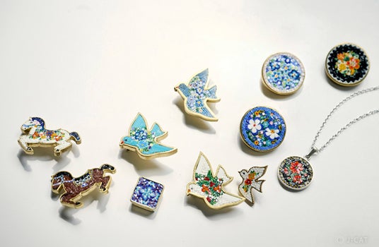 ガラス工芸「ミクロモザイク」の作家夫妻が営むガラス工房「海津屋」を貸し切り、世界にひとつだけのアクセサリーを制作するOtonami限定プラン。この体験でしかないデザインのペンダントトップ、もしくはピンブローチを自由な感性で制作します。